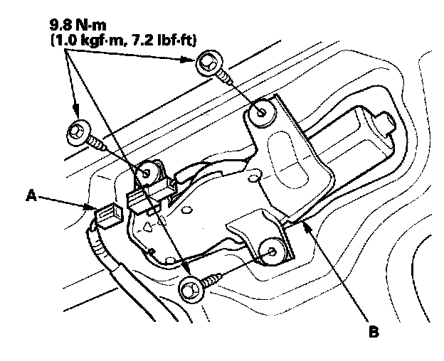 3. Disconnect the 4P connector (A) from the rear window wiper motor (B).
