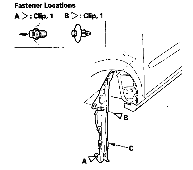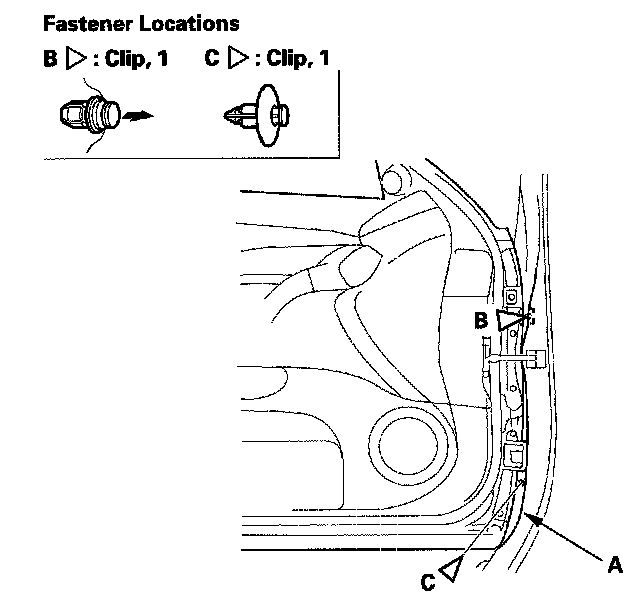 2. Open the door, and remove the clips that secure the front fender fairing (A). Remove the upper clip (B) from outside the door, and the lower clip (C) from inside the door.