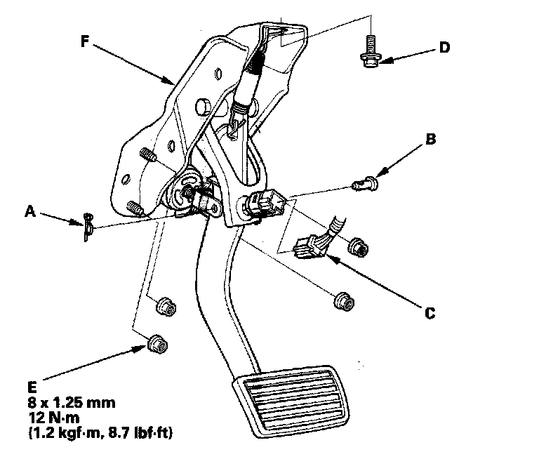 3. Remove the brake pedal bracket mounting bolt (D) and nuts (E).