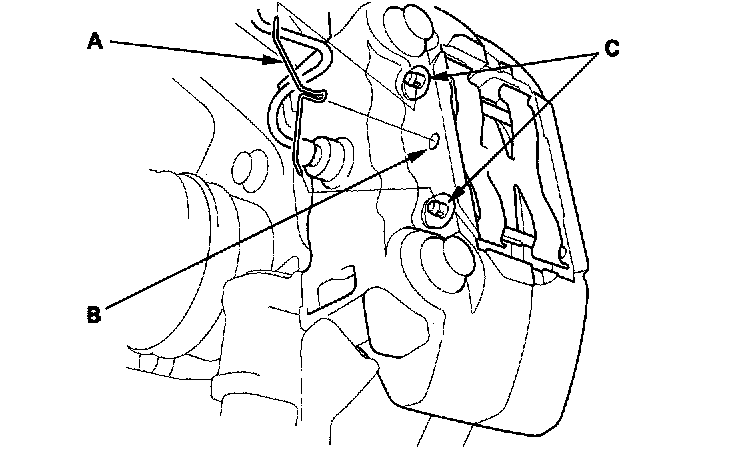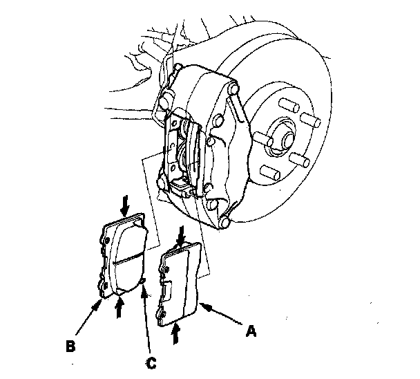12. Install the brake pads correctly. Install the brake pad with the wear indicator (C) on the inside. If you are reusing the brake pads, always reinstall the brake pads in their original positions to prevent a momentary loss of braking efficiency.