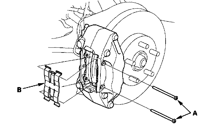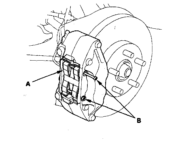 13. Install the pad spring (A). Hold the pad spring and install the pad pins (B) into the caliper from the outside to the inside of vehicle.
