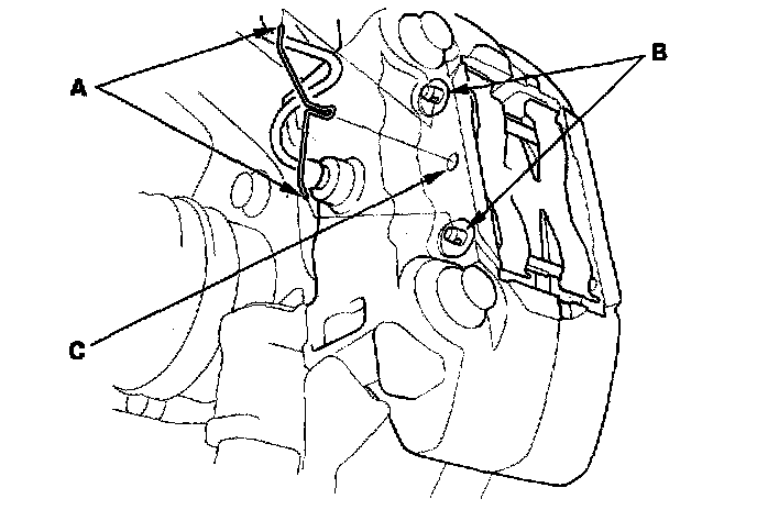 3. Turn and twist out the clip (A) from the caliper hole (B), and pull the clip out from the pad pins (C).