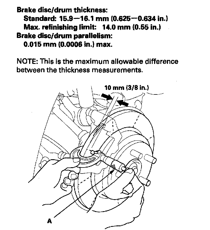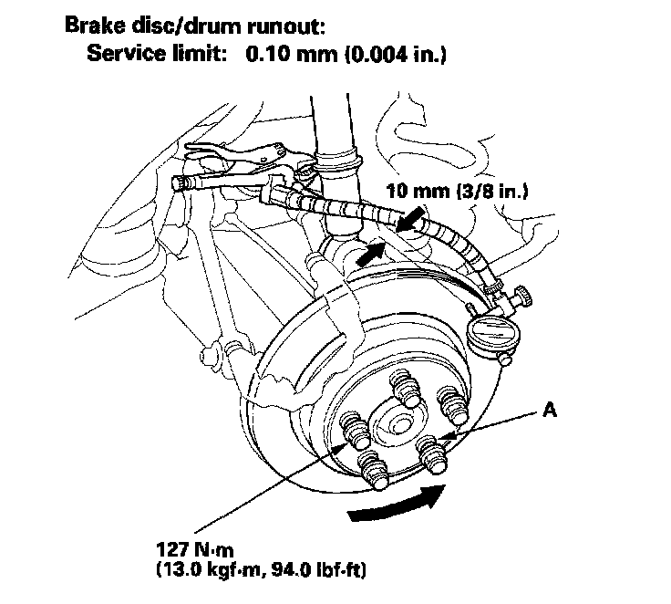 6. Set the dial gauge up against the brake disc/drum as shown, and measure the runout at 10 mm (3/8 inch) from the outer edge of the brake disc.