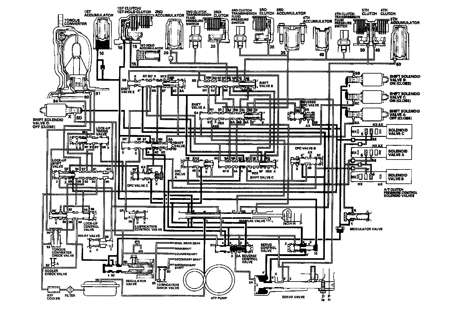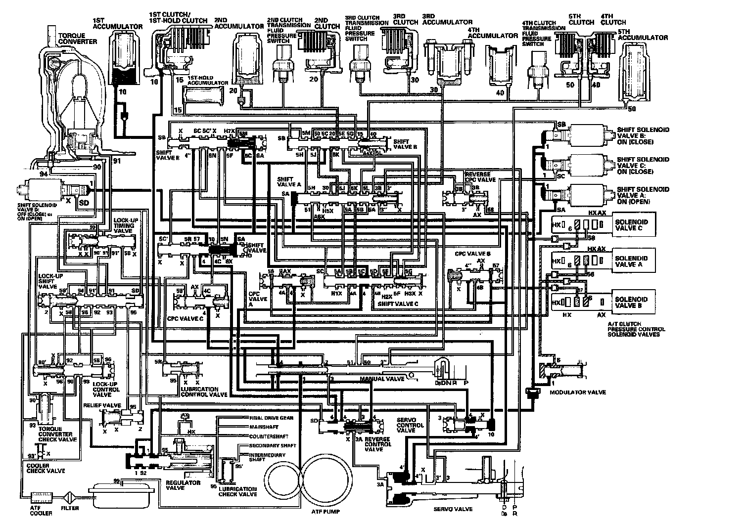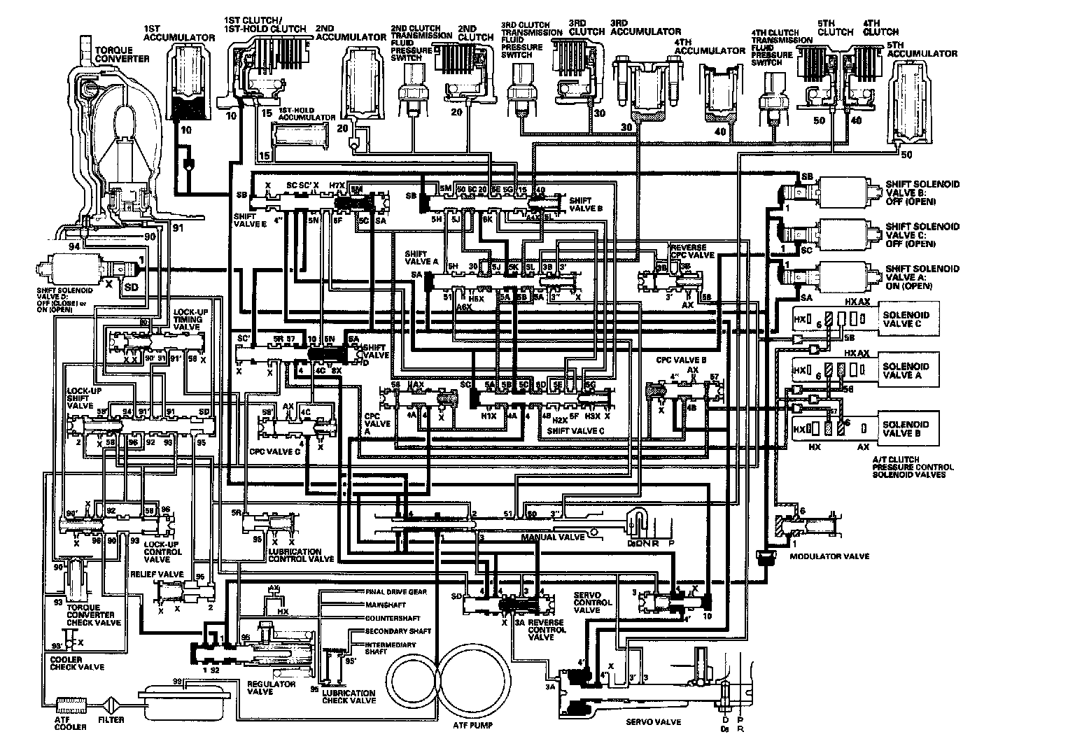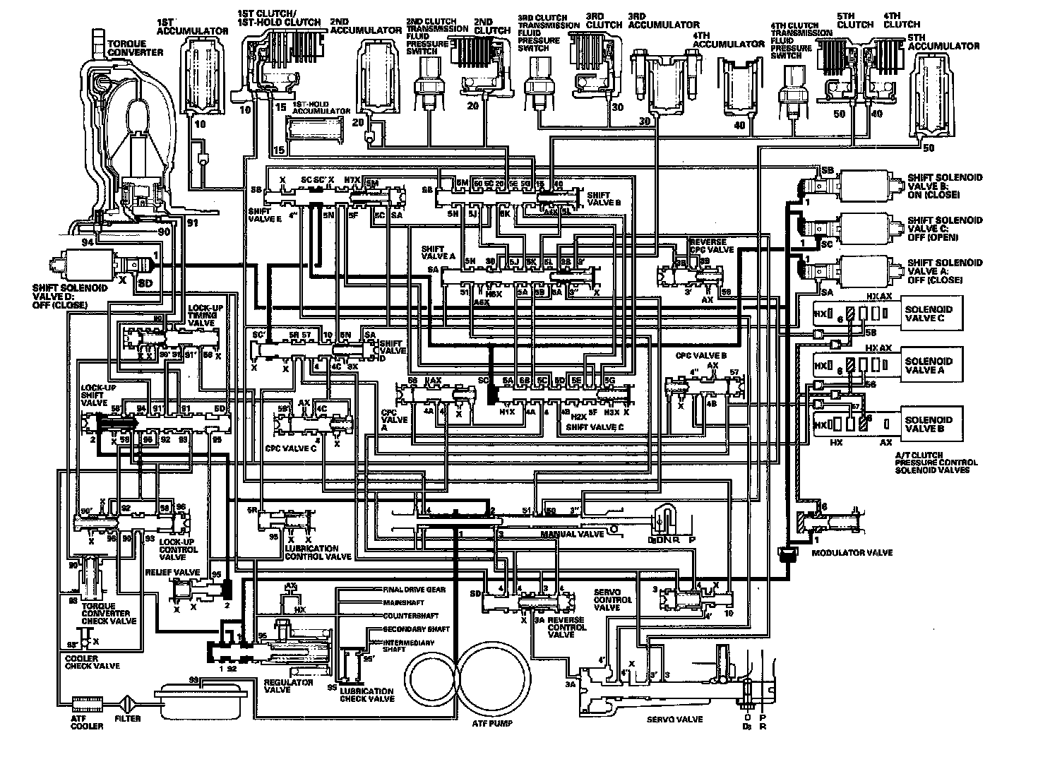 As the speed of the vehicle reaches the programmed value, the PCM turns shift solenoid valve A ON, and shift solenoid valve A uncovers the port of shift solenoid valve A pressure (SA) to the shift valve A. The shift valve A is moved to the right side to switch the port of line pressure (3') and reverse CPC pressure (3B) leading to the 5th clutch. Line pressure (3) flows to the manual valve via the servo valve and shift valve A, and becomes 5th clutch pressure (50) at the manual valve. The 5th clutch pressure (50) flows to the 5th clutch, and the 5th clutch is engaged with the line pressure mode.