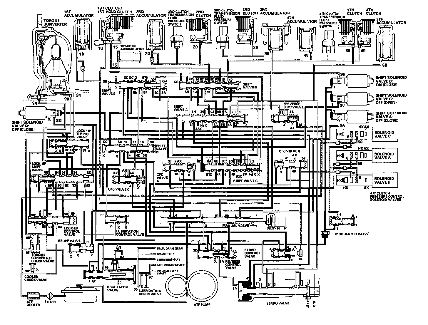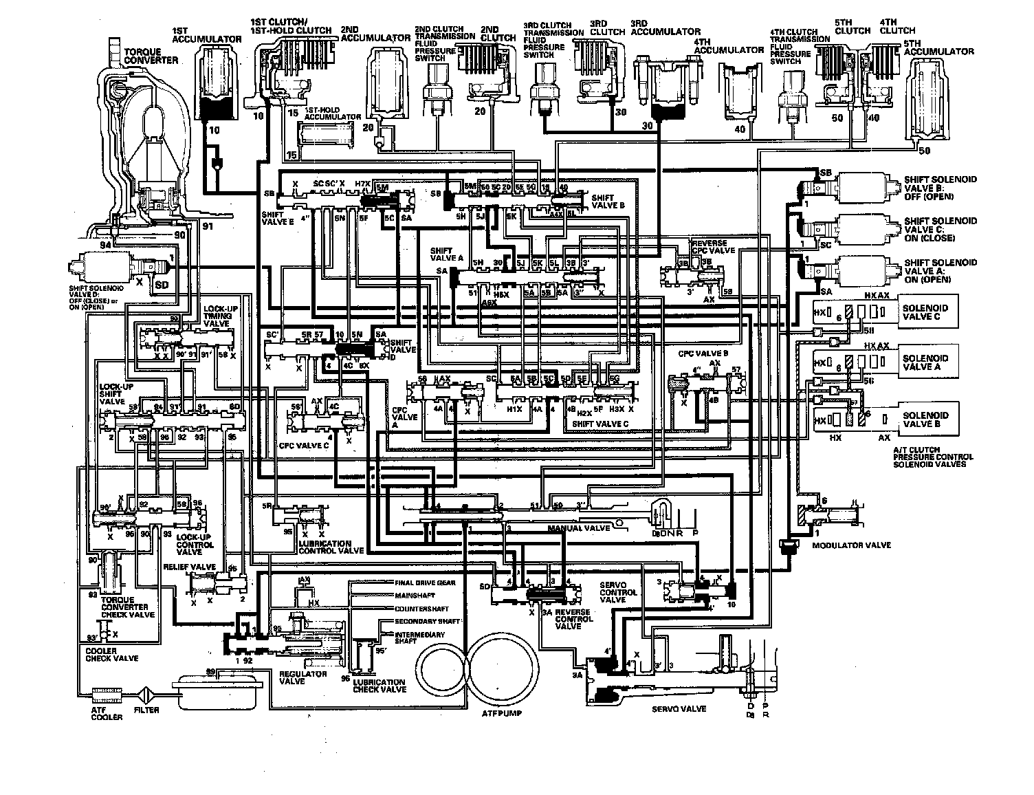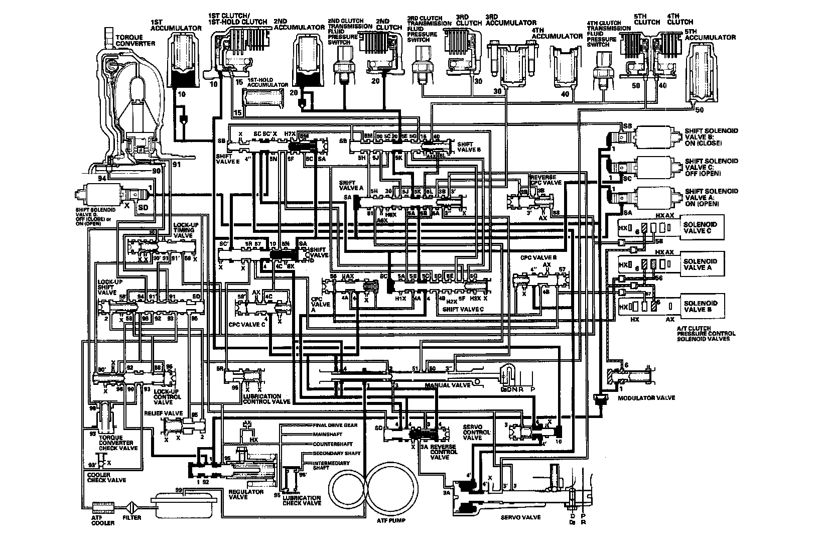 As the speed of the vehicle reaches the programmed value, the PCM turns shift solenoid valve A ON, and shift solenoid valve A uncovers the port of shift solenoid valve A pressure (SA) to the shift valve A. The shift valve A is moved to the right side to switch the port of line pressure (3') and reverse CPC pressure (3B) leading to the 5th clutch. Line pressure (3) flows to the manual valve via the servo valve and shift valve A, and becomes 5th clutch pressure (50) at the manual valve. The 5th clutch pressure (50) flows to the 5th clutch, and the 5th clutch is engaged with the line pressure mode.