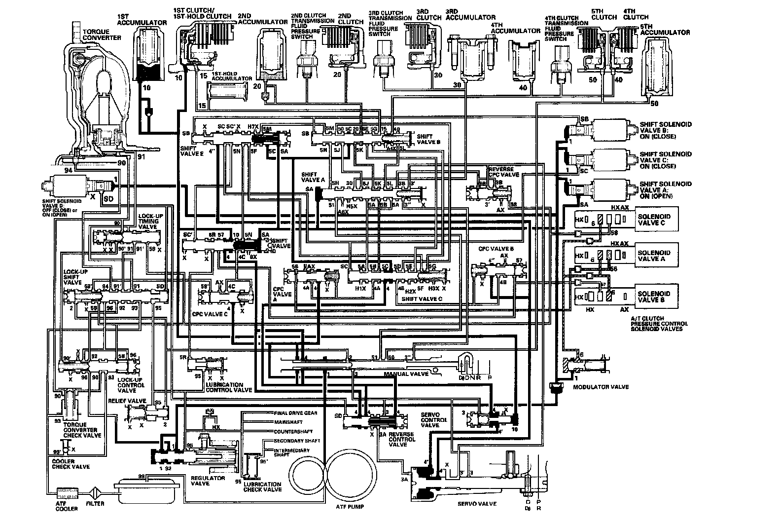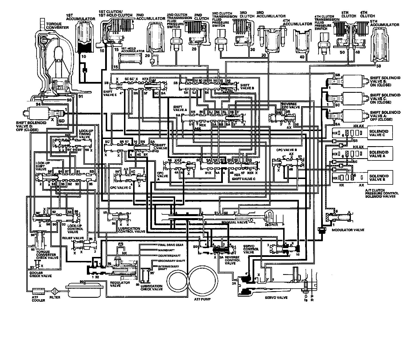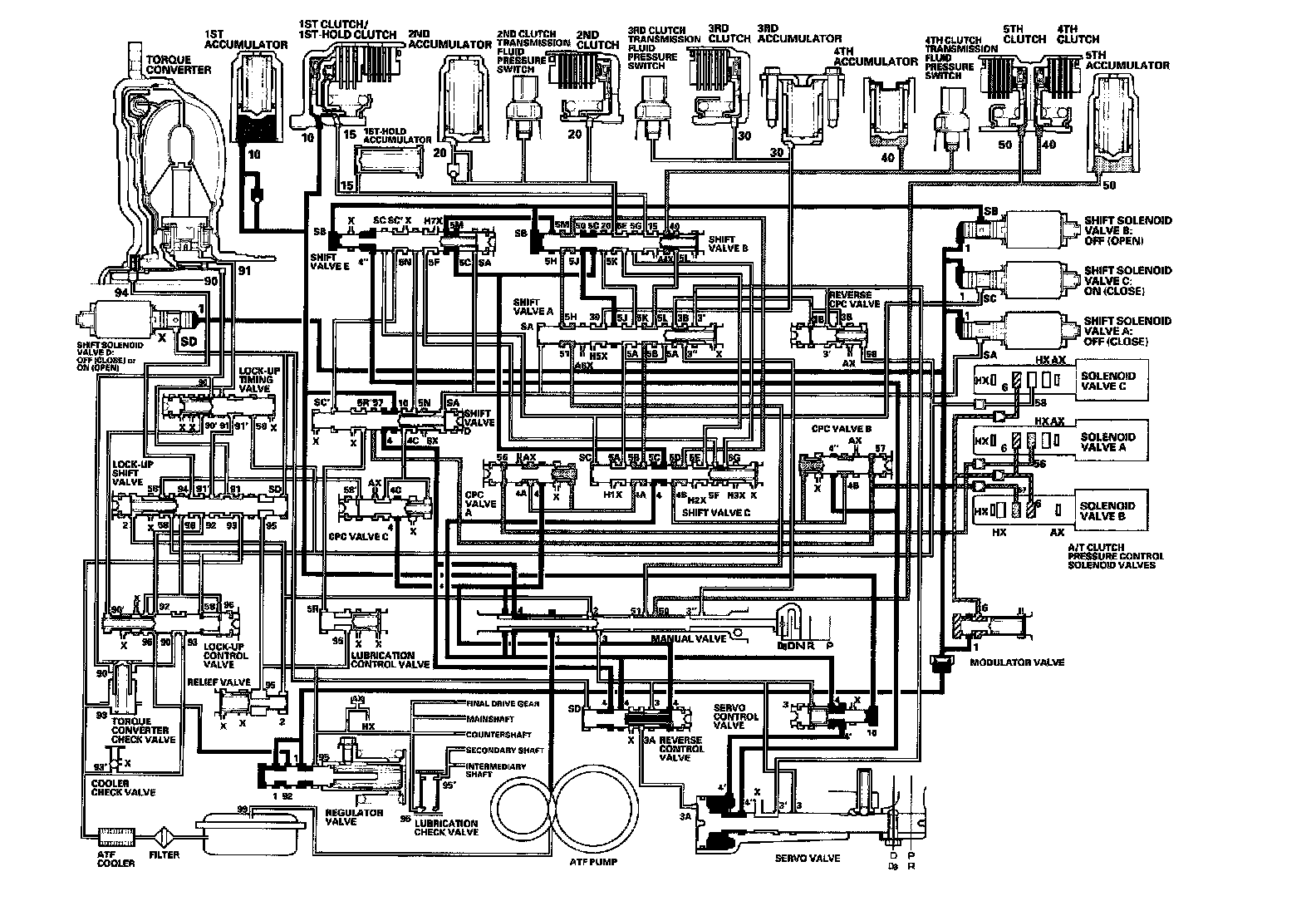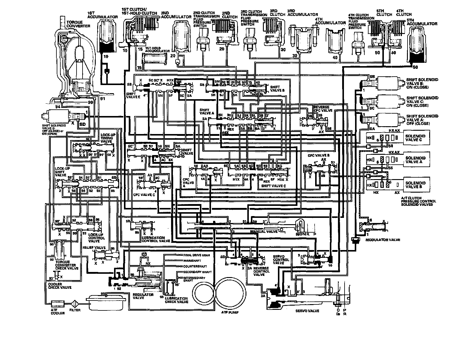 As the speed of the vehicle reaches the programmed value, the PCM turns shift solenoid valve A ON, and shift solenoid valve A uncovers the port of shift solenoid valve A pressure (SA) to the shift valve A. The shift valve A is moved to the right side to switch the port of line pressure (3') and reverse CPC pressure (3B) leading to the 5th clutch. Line pressure (3) flows to the manual valve via the servo valve and shift valve A, and becomes 5th clutch pressure (50) at the manual valve. The 5th clutch pressure (50) flows to the 5th clutch, and the 5th clutch is engaged with the line pressure mode.