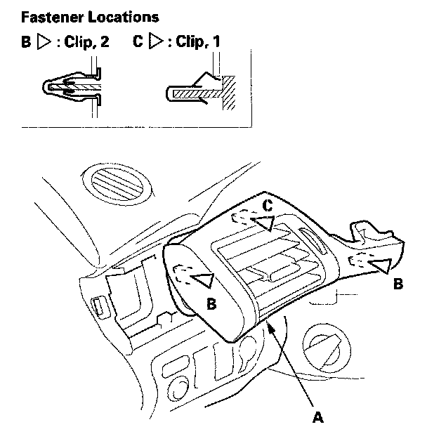 2. Gently pull out the driver's vent panel (A) to release the clips (B, C), then remove the panel.