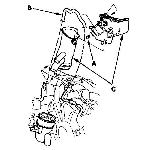 5. Remove the clip (A) and the harness (B) then remove the air intake ducts (C).