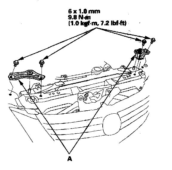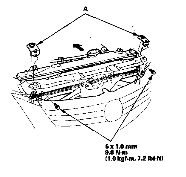 7. Remove the bolts and the radiator upper mount brackets (A).