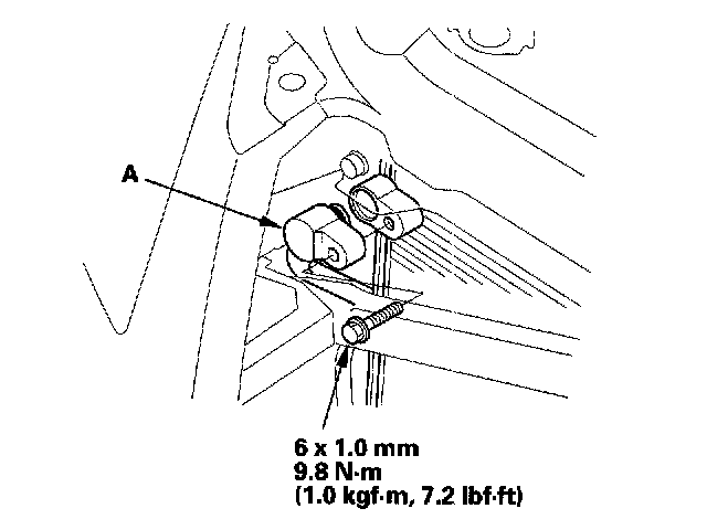 6. Remove the bolt, then disconnect the receiver line (A) from the A/C condenser.