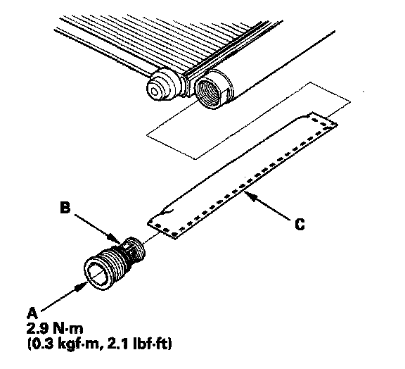 2. Remove the cap (A) from the bottom of the A/C condenser. Remove the 0-ring (B), and the desiccant (C).
