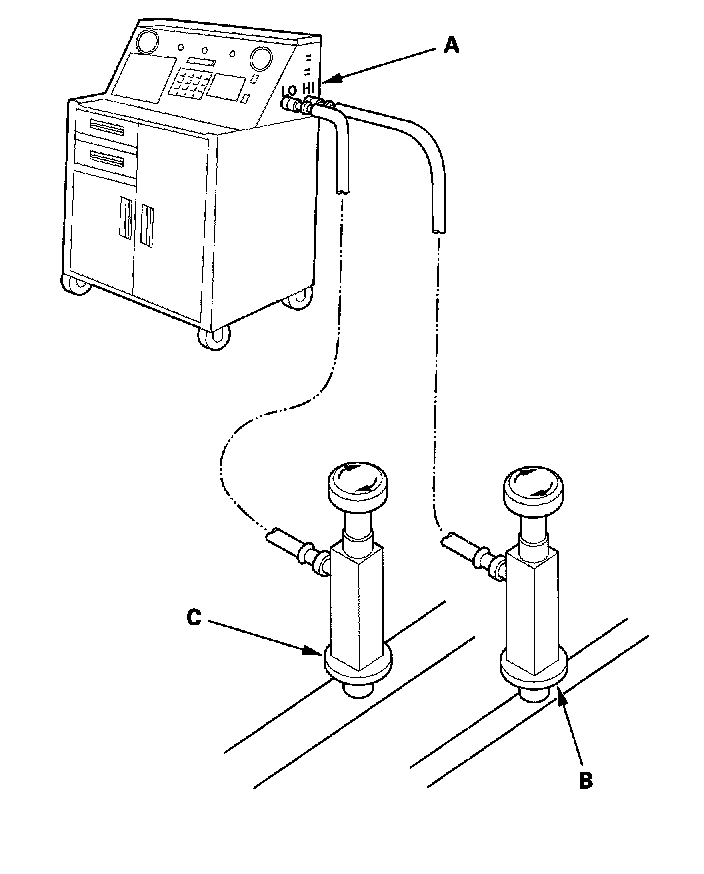 1. Connect an R-134a refrigerant recovery/recycling/charging station (A) to the high-pressure service port (B), and the low-pressure service port (C), as shown, following the equipment manufacturer's instructions.