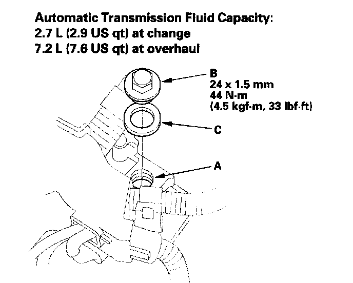 6. Install the ATF filler bolt (B) with a new sealing washer (C).