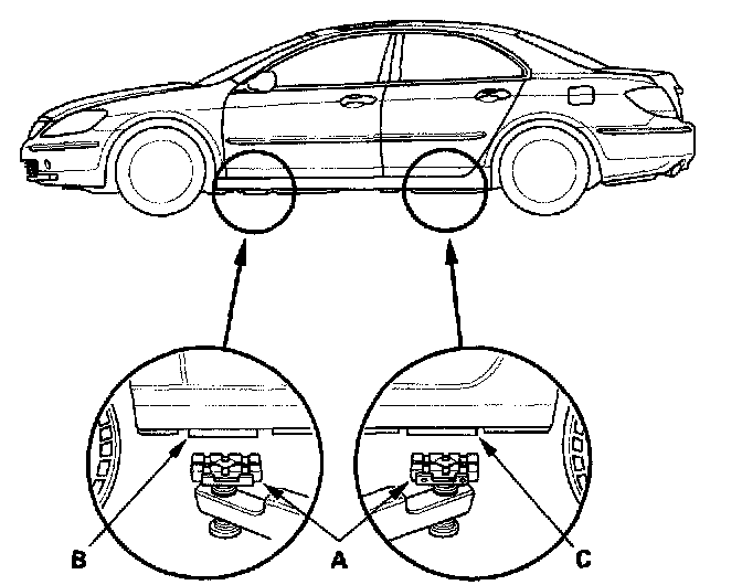 3. Position the floor jack under the front jacking bracket (A) or rear jacking bracket (B) Center the jacking bracket in the jack lift platform (C) and jack up the vehicle high enough to fit the safety stands under it.