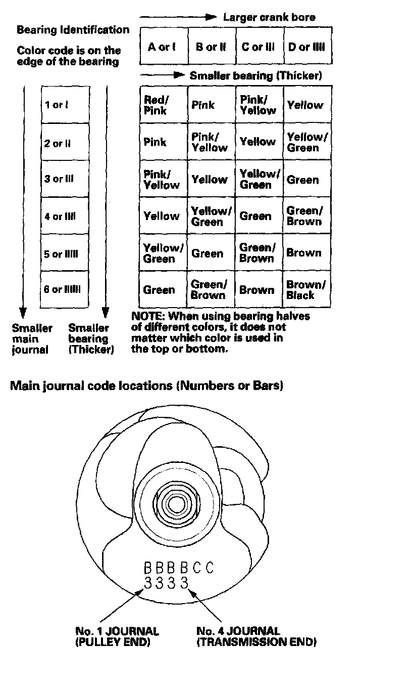 Use them, and the numbers stamped on the crankshaft (codes for main journal size), to choose the correct bearings. If the codes are indecipherable because of an accumulation of dirt and dust, do not scrub them with a wire brush or scraper. Clean them only with solvent or detergent.