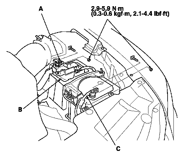 3. Reconnect the positive cable (A) to the battery (B) first, then reconnect the negative cable (C) to the battery.