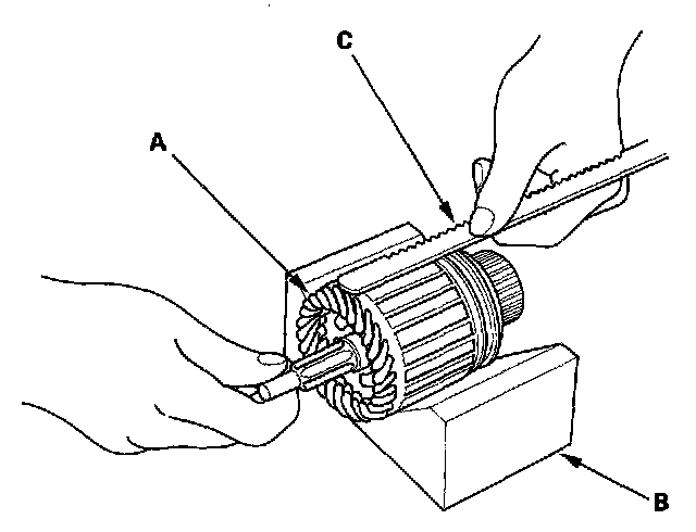 12. Place the armature (A) on an armature tester (B). Hold a hacksaw blade (C) on the armature core. If the blade is attached to the core or vibrates while the core is turned, the armature is shorted. Replace the armature.