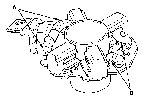 15. Check for continuity between the (+) brush (A) and (-) brush (B). If there is continuity, replace the brush holder assembly.