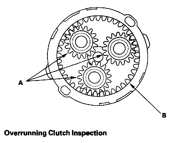 19. If the starter drive gear (B) is worn or damaged, replace the overrunning clutch assembly; the gear is not available separately. Check the condition of the idler gear and drive plate ring gear to see if the starter drive gear teeth are damaged.