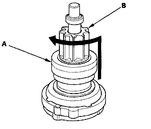 18. Rotate the overrunning clutch (A) in both directions. It should lock and move upward in one direction and rotate smoothly in the other direction. If it does not lock in either direction or if it locks both directions, then replace it.