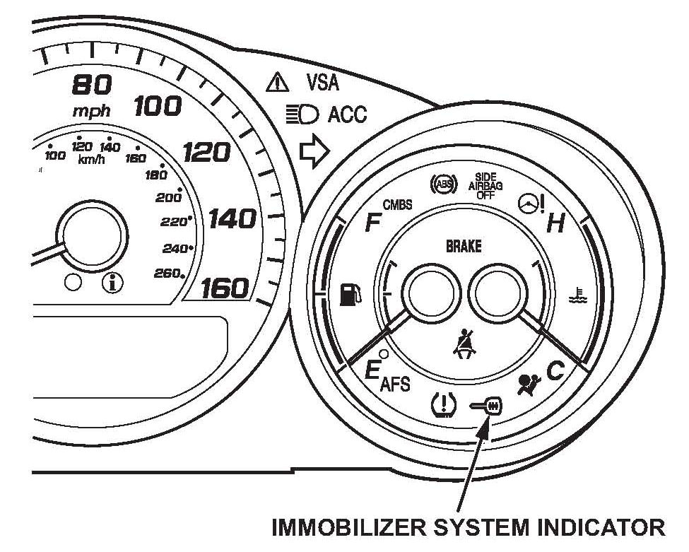 This procedure is only a temporary fix. When you start the engine with the temporary key, the immobilizer indicator comes on and stays on while the engine is running. And when you turn the ignition switch to LOCK (0), the indicator does not blink as it normally would.