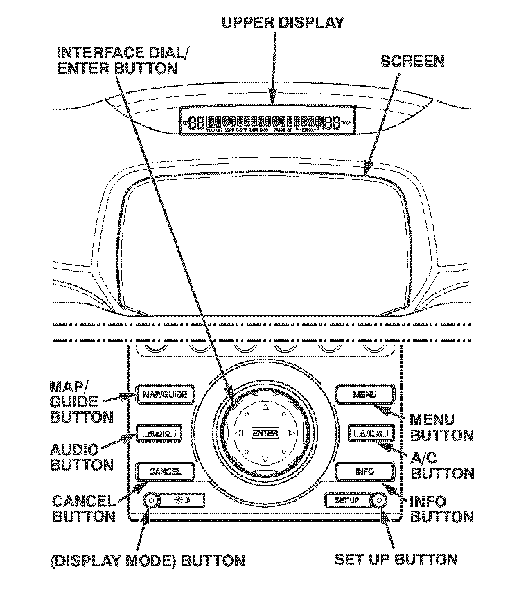 Upper Display - Shows the radio information, the climate control information, and the time.