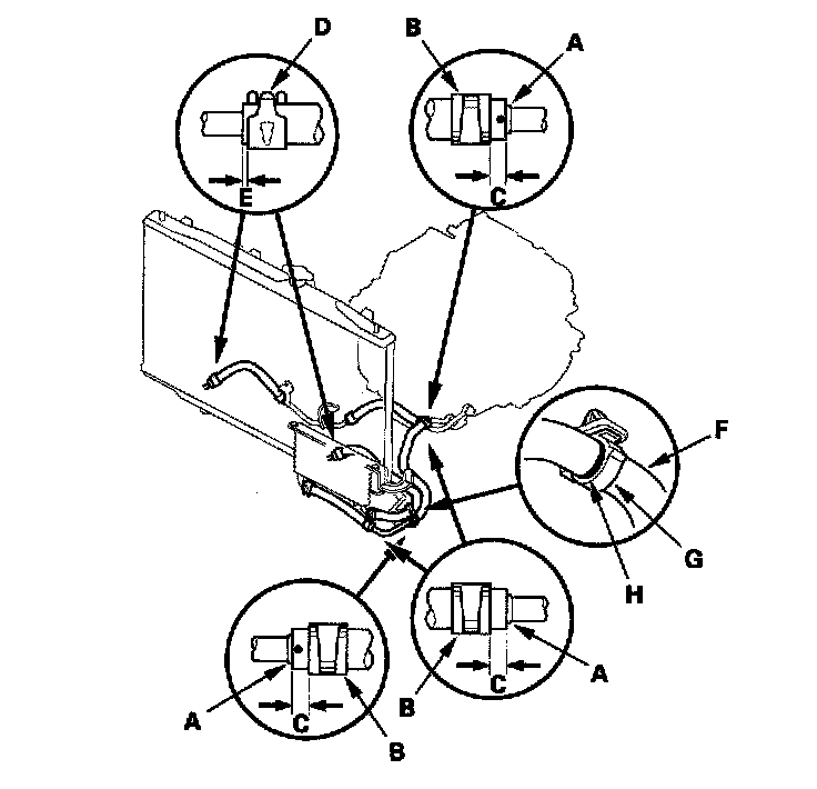 4. Install the ATF cooler hose (F) on the clamp (G) at the mark (H).