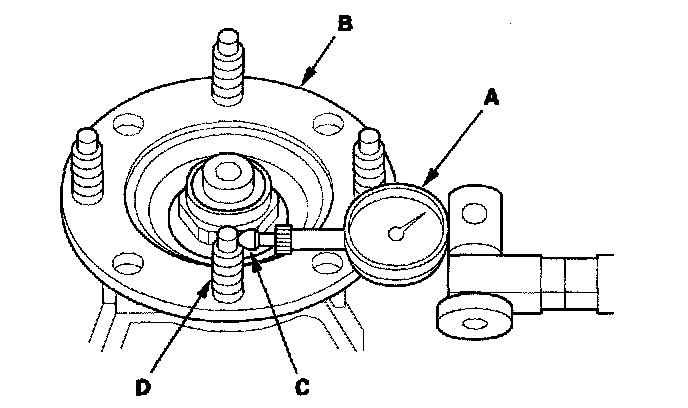 1. Set a dial indicator (A) on the transfer companion flange (B); position the dial indicator tip (C) on the top of the bolt (D).