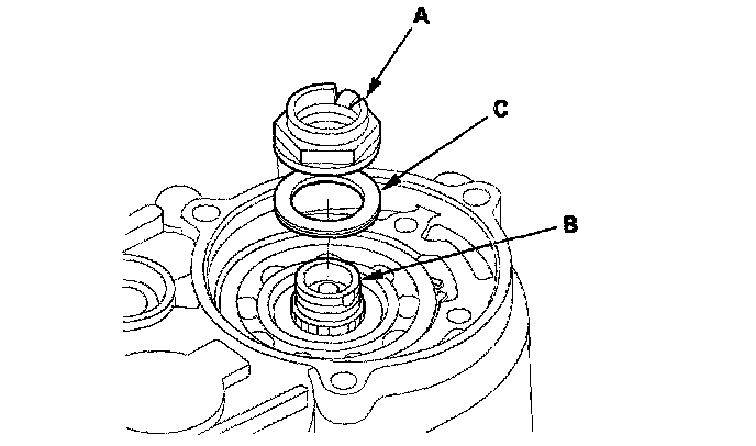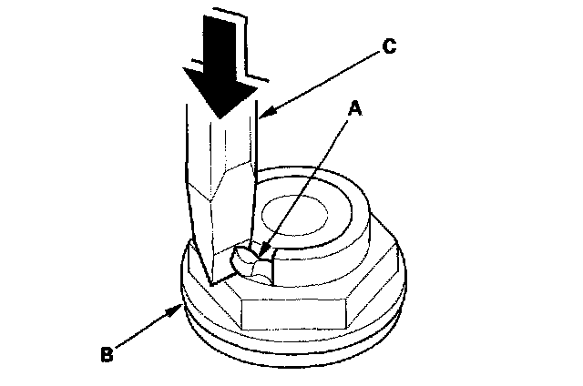 17. Cut the lock tab (A) of the mainshaft locknut (B) using a chisel (C).