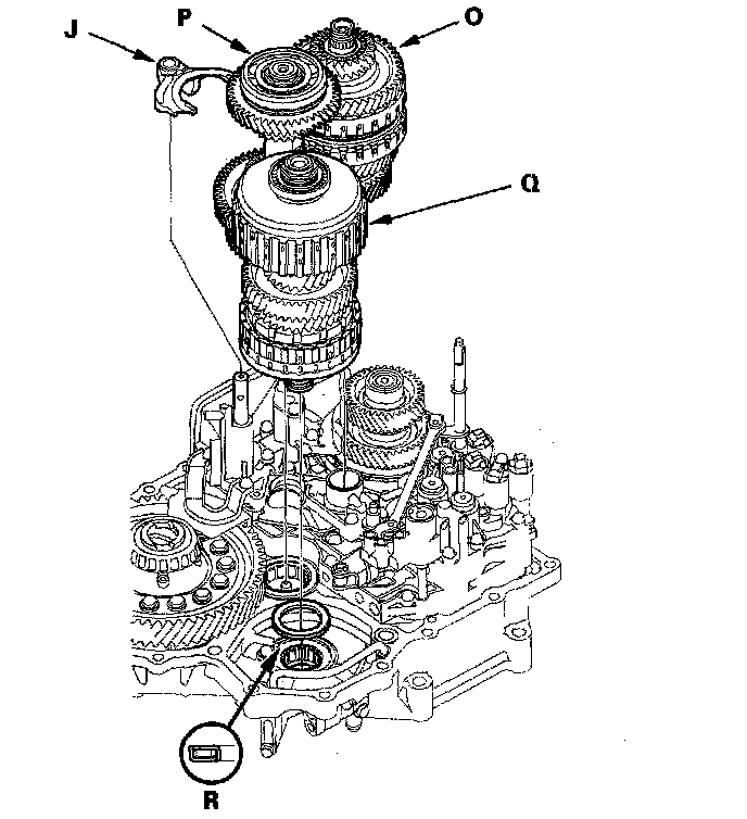 29. Remove the mainshaft (0), countershaft (P), shift fork (J), and secondary shaft (Q) together, and remove the needle bearing (R) from the torque converter housing.