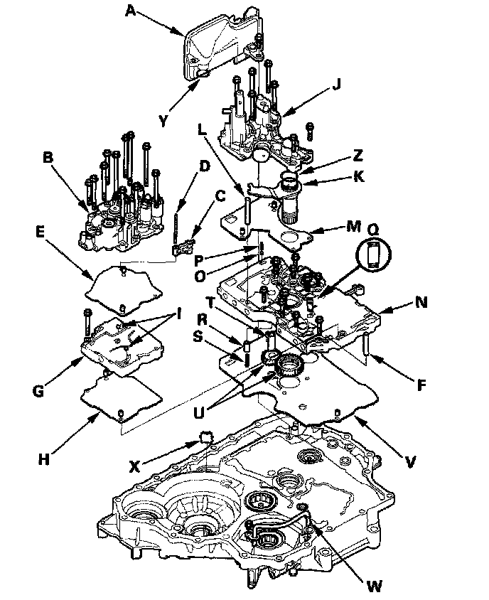 41. Remove the main valve body (N) (8 mm: three bolts, 6 mm: seven bolts). Do not let the cooler check valve (ball) (O), spring (P), and lubrication check valve (Q) fall out.