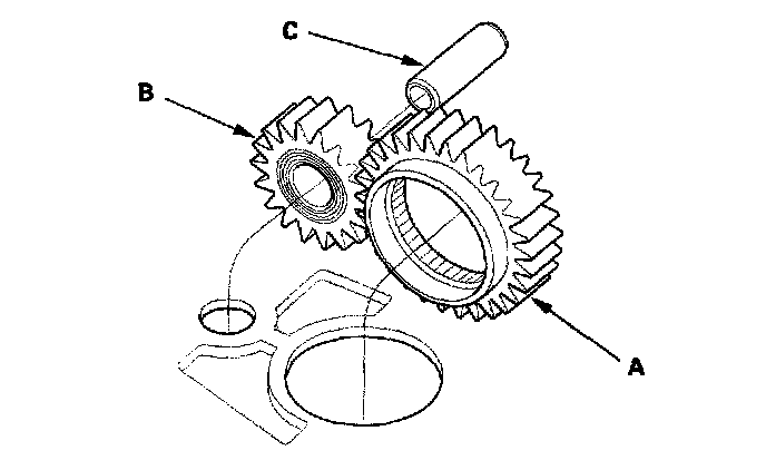 2. Install the main separator plate and the two dowel pins on the torque converter housing. Then install the ATF pump drive gear (A), driven gear (B), and ATF pump driven gear shaft (C). Install the ATF pump driven gear with its grooved and chamfered side facing down.