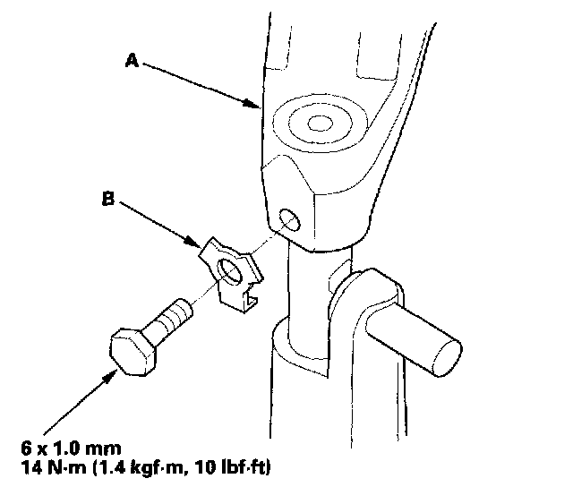 27. Secure the shift fork (A) to the shift fork shaft with the lock bolt and the new lock washer (B), then bend the lock tab of the lock washer against the bolt head.