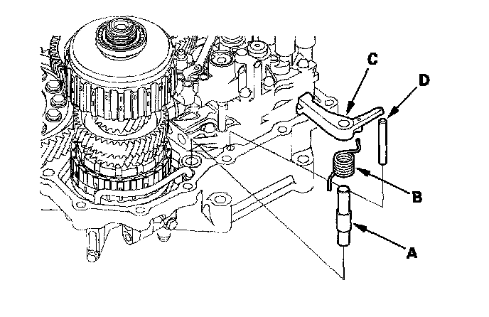 28. Install the park pawl shaft (A), pawl spring (B), park pawl (C), and park pawl stop (D).