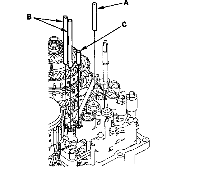 63. Set the transmission range switch (A) to the N position. The transmission range switch clicks in the N position, and the selector control shaft hole (B) aligns with the N positioning line (C).