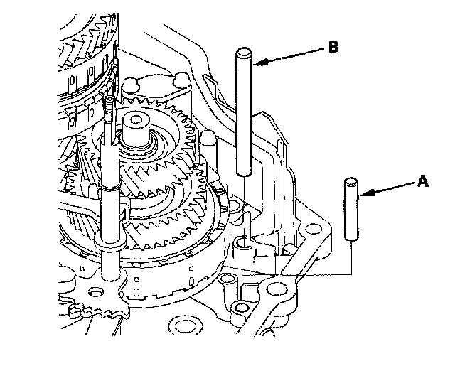 25. Turn the shift fork shaft (B) so the large chamfered hole is facing the fork bolt hole of the shift fork.