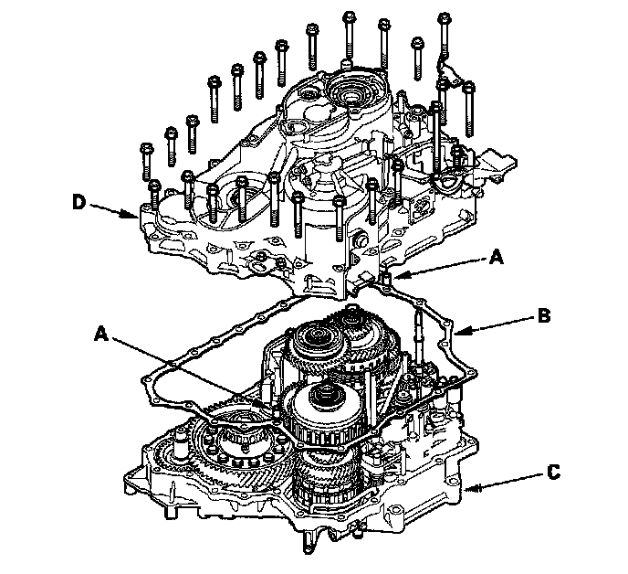 34. Place the transmission housing (D) on the torque converter housing.