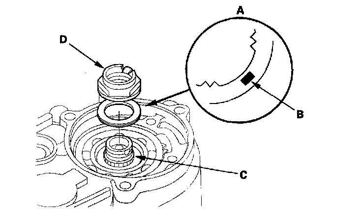 41. Install the new lock washer (A) with the marked side (B) up over the mainshaft (C), and apply the surfaces of the lock washer and old locknut (D) with ATF.