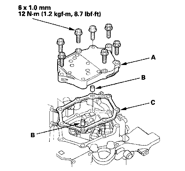 54. Install the solenoid valve cover (A) with the two dowel pins (B) and the new gasket (C), and secure it with the seven bolts.