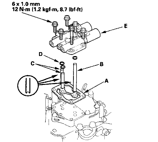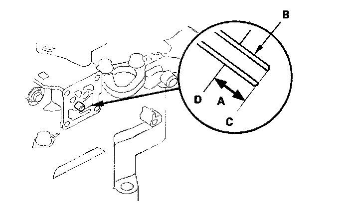 58. Check the height (A) of the 8 x 53 mm ATF joint pipe (B) between the top (C) of the pipe and the solenoid valve body mounting surface (D). The height is about 7 mm (0.3 inch) If the height is over 7 mm (0.3 inch), install the pipe securely until it stops the accumulator body.