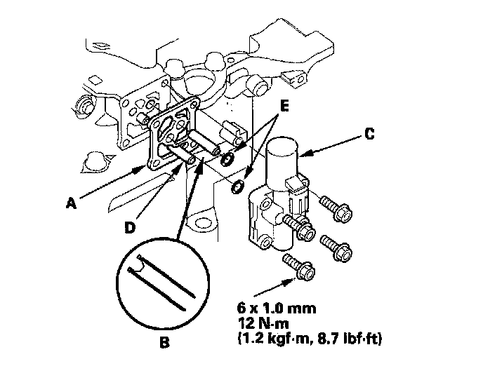 56. Install the new O-rings (D) over the ATF feed pipes, and install the A/T clutch pressure control solenoid valves A and B (E).