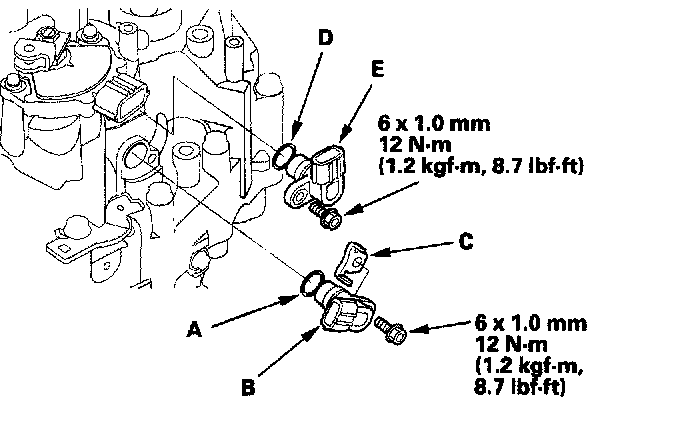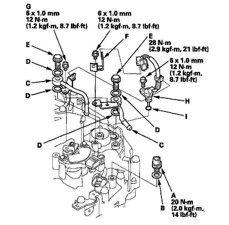 74. Install the connector bracket (F), and secure the ATF lines with the 6.0 mm bolt (G) on the transmission housing. Tighten the bolts to 12 Nm (1.2 kgf-m, 8.7 ft. lbs.).