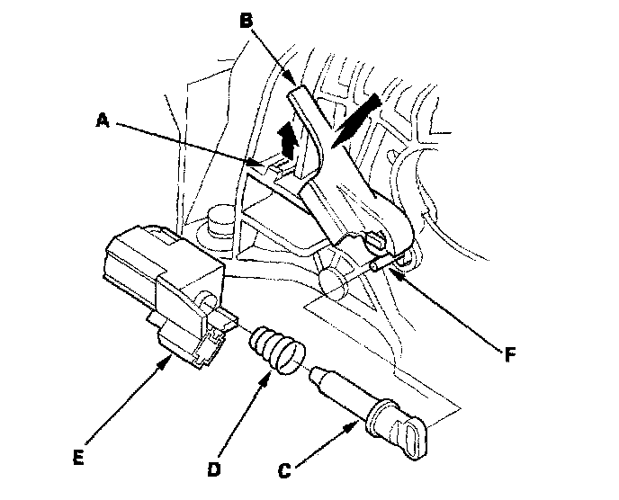 6. Install the new shift lock solenoid by aligning the joint of the shift lock solenoid plunger with the tip of the shift lock stop (F).