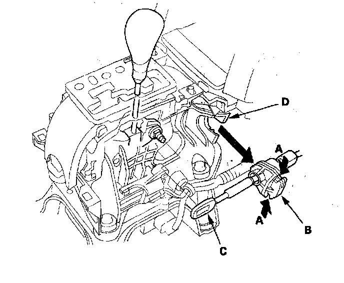 5. Press the holder lock release (A), and pull out the socket holder (B) to remove the shift Cable (C) from the shift lever bracket base (D).