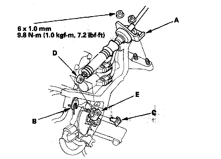 13. Remove the spring clip/washer (8) and control pin (C), then separate the shift cable end (D) from the control lever (E).