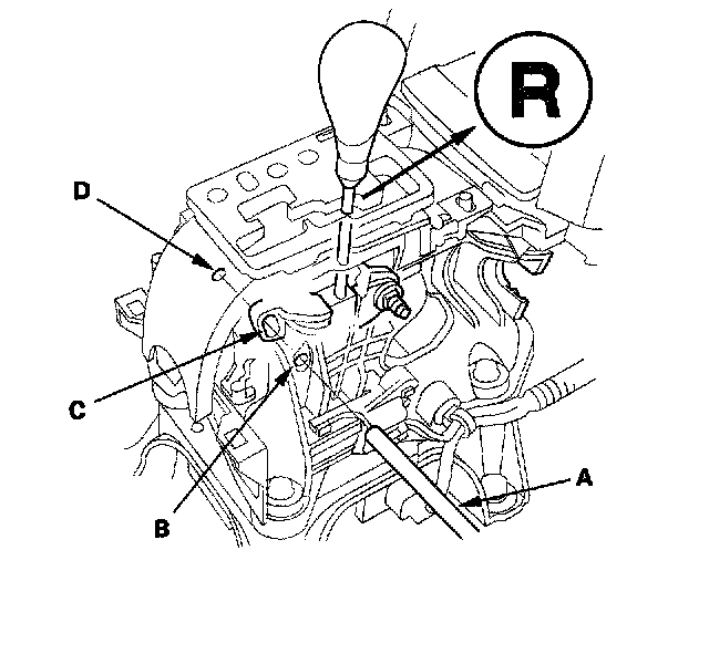 25. Place the shift lever in the R position, then insert a 6.0 mm (0.24 inch) pin (A) through the positioning hole (B) on the shift lever bracket base, through the positioning hole (C) on the shift lever, and into the positioning hole (D) on the shift lever bracket base. The shift lever is secured in the R position.