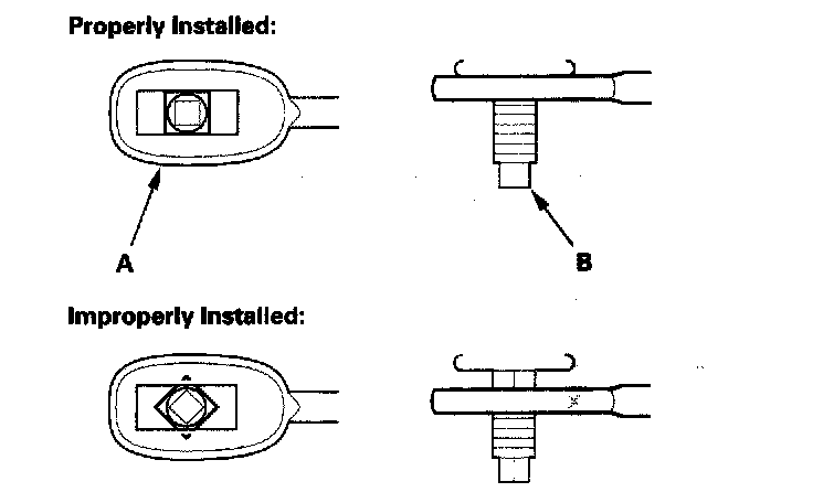 27. Verify that the shift cable end (A) is properly installed on the mounting stud (B).
