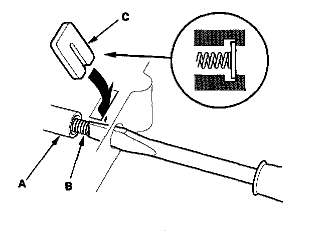 3. Install the valve (A) and valve spring (B) in the valve body. Push the valve spring in with a screwdriver, then install the spring seat (C).