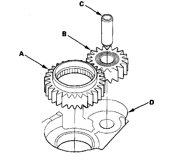 1. Install the ATF pump drive gear (A), driven gear (B), and ATF pump driven gear shaft (C) in the main valve body (D). Lubricate all parts with ATF, and install the ATF pump driven gear with its grooved and chamfered side facing up.