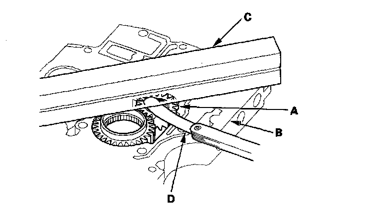 3. Remove the ATF pump driven gear shaft. Measure the thrust clearance between the ATF pump driven gear (A) and the valve body (B) with a straight edge (C) and a feeler gauge (D).